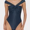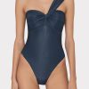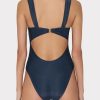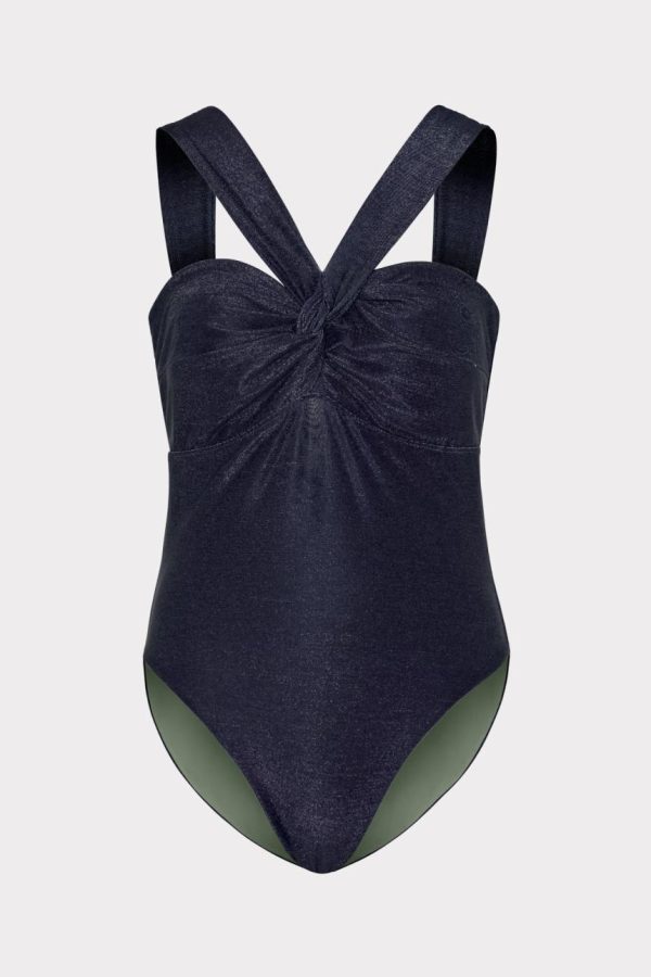 Made from luxe sustainable Italian swim fabric with shimmer detail, this timeless one-piece has moveable straps that can be worn off-the-shoulder or twisted across the chest. It has removable cups, a skin-baring open back, and clasps in the back to close.
