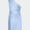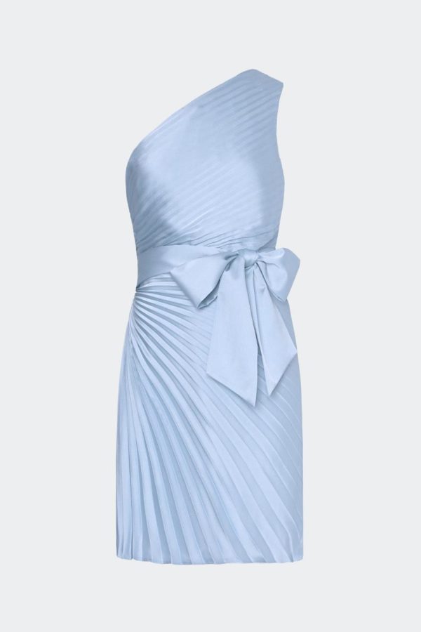 Get ready for a long night on the dance floor with the Estie dress. Cut from a unique stretch satin, it features a one-shoulder, fitted bodice that falls to a sharply pleated mini skirt and is finished with a dramatic tie at the waist. Just add a pair of platform heels and party all night.