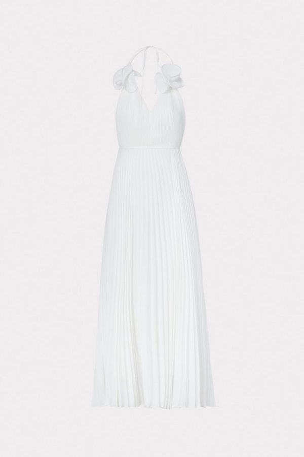 Our Evie maxi dress comes accented with a romantic rosette detail on each shoulder. It has a halter neckline that ties around the neck and is pleated throughout. Wear it to weddings, garden parties, pool parties, and more. It comes in Milly Pink, Tangerine, White, and Sky.