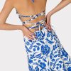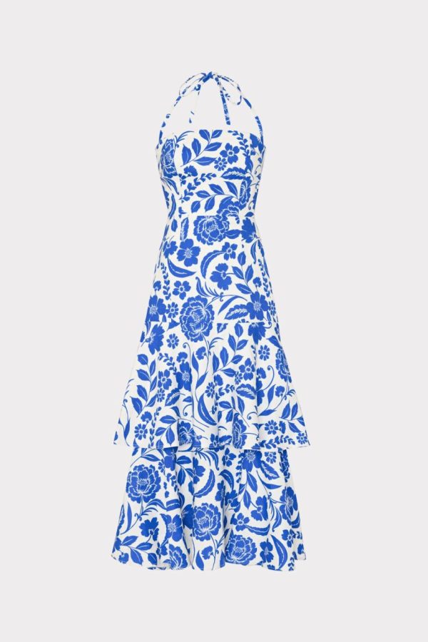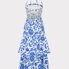 Our Flowers of Spain dress is perfect for vacations, or bringing that spirit to all of your warm weather events. Printed with bright blue flowers, it’s made from lightweight linen with a hint of stretch. It’s designed with a fitted, tiered skirt that falls to a maxi length hemline and has a criss cross tie detail in the back.