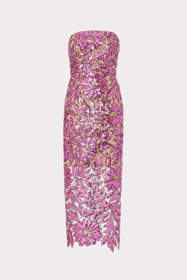 A floral sequin lace design is embroidered throughout this stunning strapless, tea length dress—a standout piece in the Summer Collection. Every time you wear it you’ll feel glamorous, without sacrificing comfort.