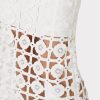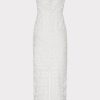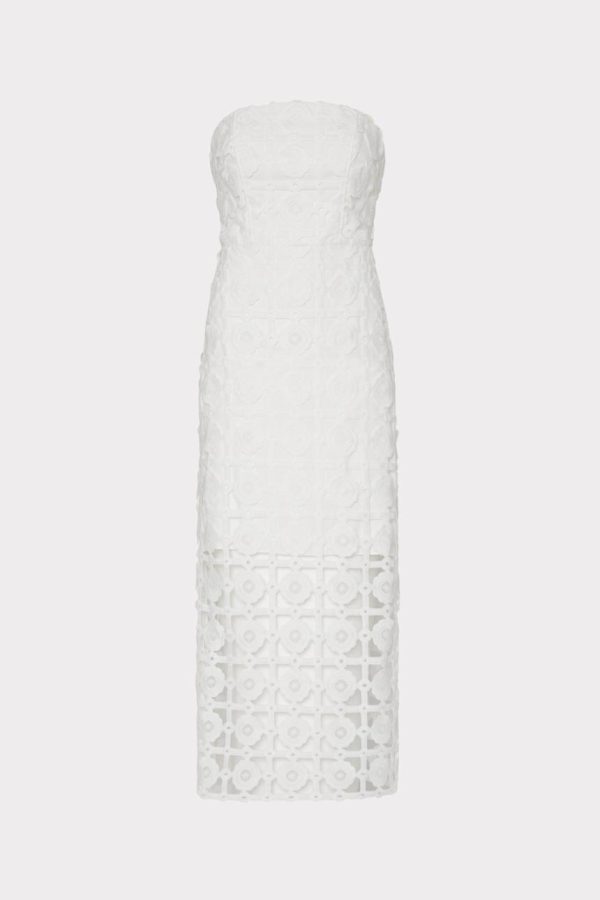 For your next exclusive party, bring the glamour with our strapless Kait dress. This ankle length dress features an artisanal, textured tile pattern that serves as an overlay to reveal bare legs past the knee. It has a boned-in bodice for shape and a chic, straight silhouette. Style yours with an ultra high heel.