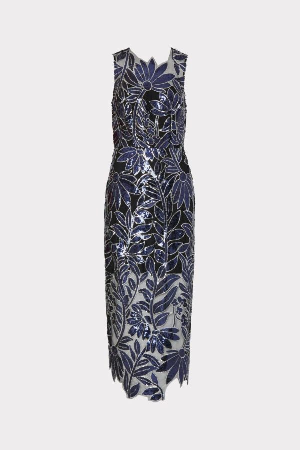 A floral sequin design is embroidered throughout this elegant sleeveless midi length dress with a modest neckline—a standout piece in the Resort collection. Every time you wear it you’ll feel special, without having to sacrifice comfort.