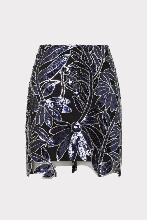 This mini skirt is beyond ready for party season. This ultra mini silhouette features an overlay of 3D floral sequins—a MILLY signature. Wear yours with a MILLY Feather Cuff V-neck Sweater and a pair of high heels.