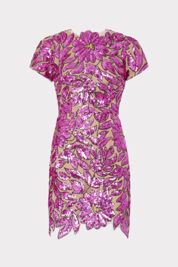 A floral sequin lace design is embroidered throughout this stunning short sleeed minidress—a standout piece in the Summer Collection. Every time you wear it you’ll feel special, without sacrificing comfort.