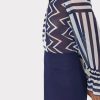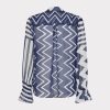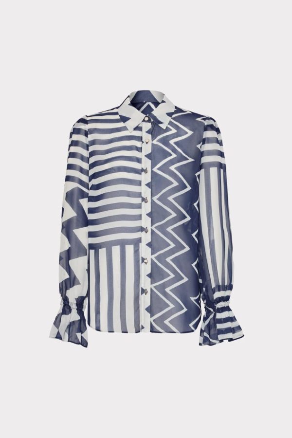 This semi-sheer button-down has an understated sharp-edged collar and ruffles on the sleeve for added charm. Pair it with your favorite denim, skirt, or wide-leg pants—the options are endless. For Fall, it comes in our Patchwork Chevron print.