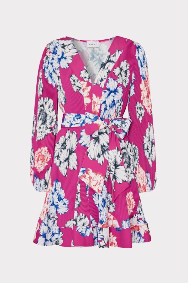 This pleated short dress features a slim peasant sleeve, a v-neckline, a pleated skirt, and a tie at the waist for added shape. It works so well for both day and night. For Spring, it comes in our new Petals in Bloom print.