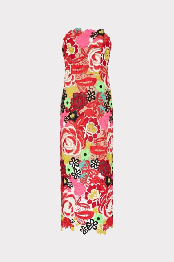 Rendered from stunning embroidered floral lace—a MILLY signature style—this sleek, strapless dress is ready for all of your Spring and Summer cocktail parties. It’s lined to the mid-thigh to reveal bare legs past the knee.