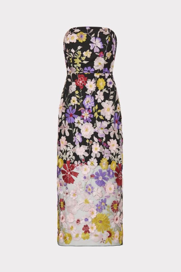 Multi Floral Embroidery Sheer Strapless Midi Dress | Women Milly Dresses