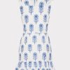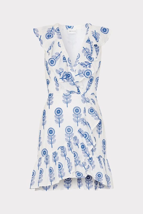 Cut from 100% cotton, the Novi Poppy Mini Dress is defined by intricate blue embroidery atop stark white. It features a surplice neckline, a faux wrap skirt, and is finished with ruffle detail on both the bodice and skirt.