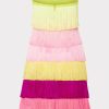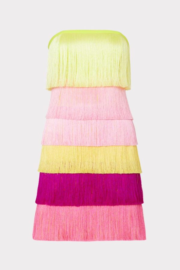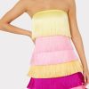 For all of your summer soirées, the Nuoir dress is layered with rows of ombré sherbet-hued fringe. It has boning throughout the bodice for a snug fit and hits well above the knee.