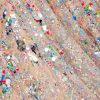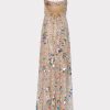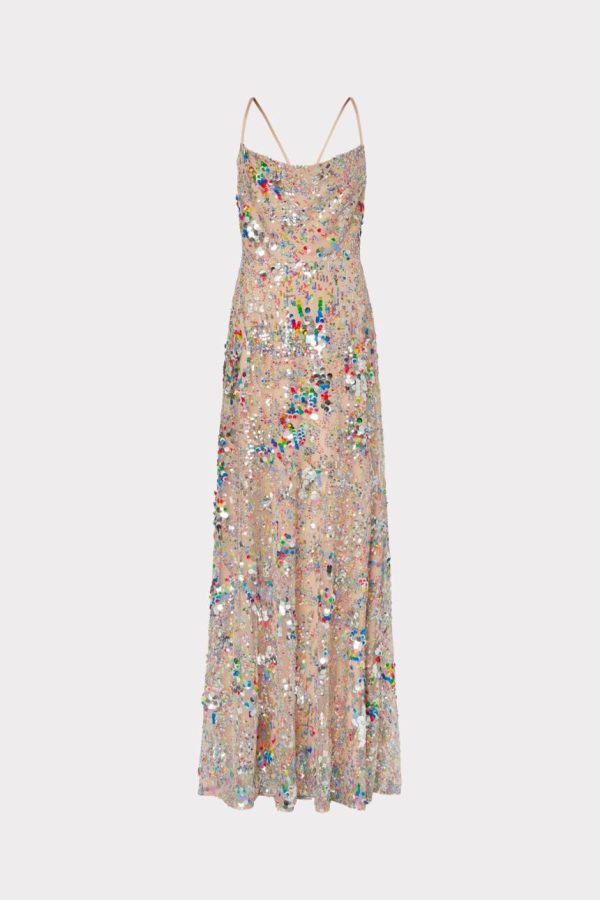 One of the most glamorous looks in the Summer collection, the Odetta maxi is covered in our 3D confetti-colored sequins. Designed with a sultry draped neckline, delicate spaghetti straps, and a low cut back with a criss cross tie detail, this show-stopping gown will get you on the best dressed list at all of your summer weddings.