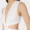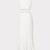 The Orlla maxi dress is cut from an all-white 3D dot clip fabric that adds both dimension and texture. It’s fitted throughout the bodice, with a trumpet skirt that lends a sultry hourglass shape. It features a skin-baring cutout detail at the waist.