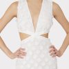 The Orlla maxi dress is cut from an all-white 3D dot clip fabric that adds both dimension and texture. It’s fitted throughout the bodice, with a trumpet skirt that lends a sultry hourglass shape. It features a skin-baring cutout detail at the waist.