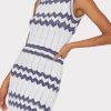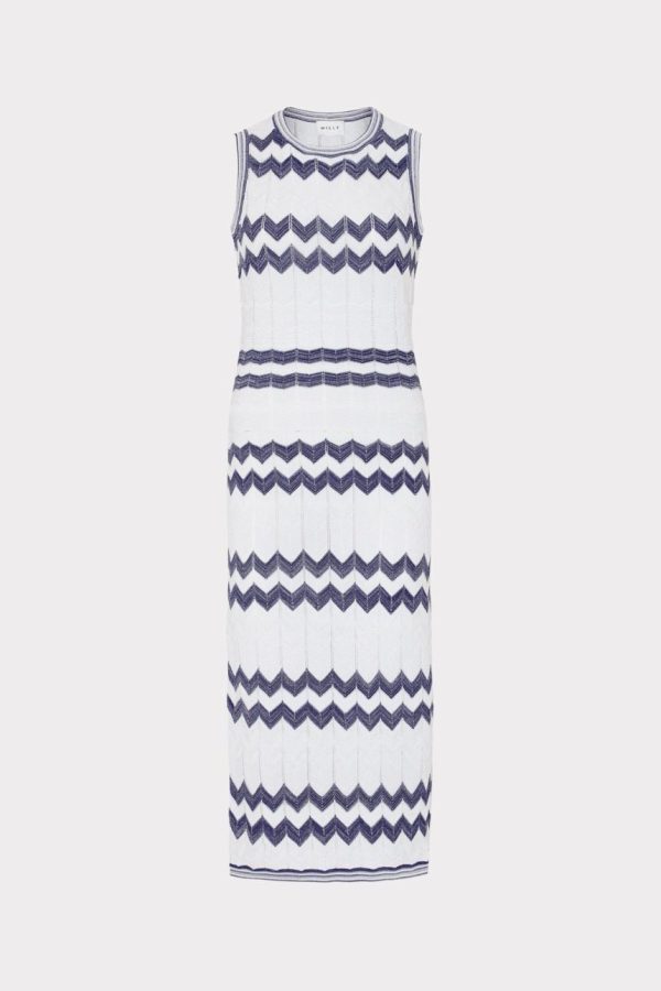 Every season, MILLY offers an updated take on our iconic luxe knits. For Resort, our zig zag chevron knit fabric comes in a neutral color way with metallic detail throughout. It’s cut to fit close to the body and has flattering side slits for ease of movement. Wear it with flat slides during the day or dress it up with heels.