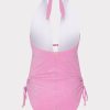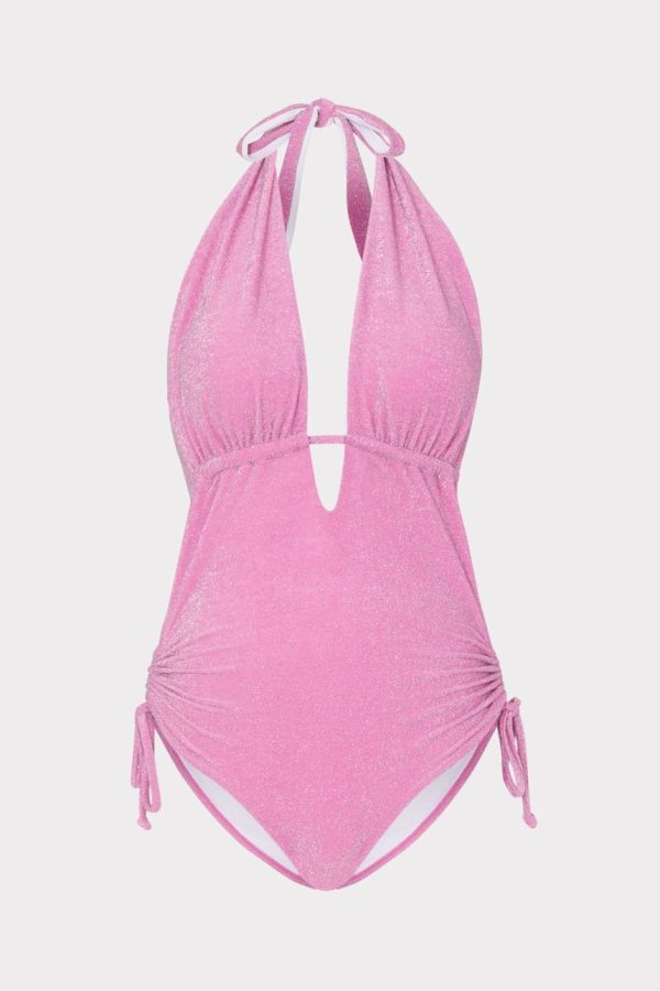 Made from luxe, sustainable Italian swim fabric with a hint of shimmer, this minimally sleek one-piece has a plunging halter neckline featuring a keyhole detail at the center. There’s also a flattering ruching detail with ties at the hip. Style your suit with your favorite MILLY coverup and a pair of dark shades.