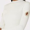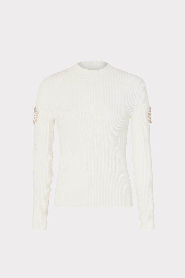 This sporty and sleek love sleeved ribbed knit features a cozy mock neckline. It has cut out details on each arm that are bedazzled with unique rhinestone trim detail. Wear it with denim or tuck it into your favorite MILLY pant.