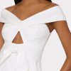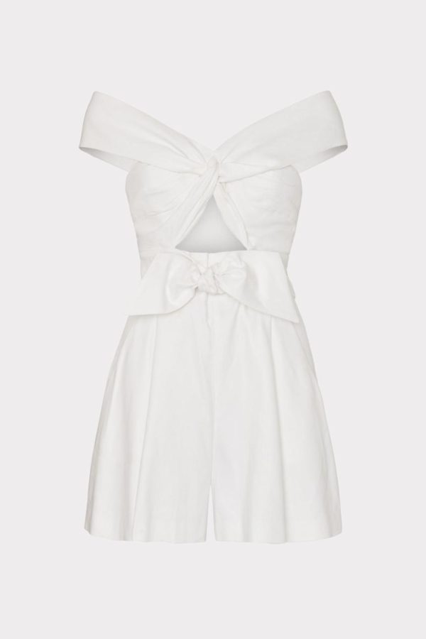 Cut from a crisp, lightweight linen, this chic and versatile romper features a dramatic off-the-shoulder silhouette and a considerable cut-out detail in the front. Style yours with flats during the day or dress it up for a night out.